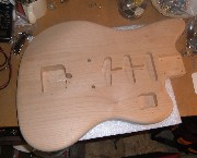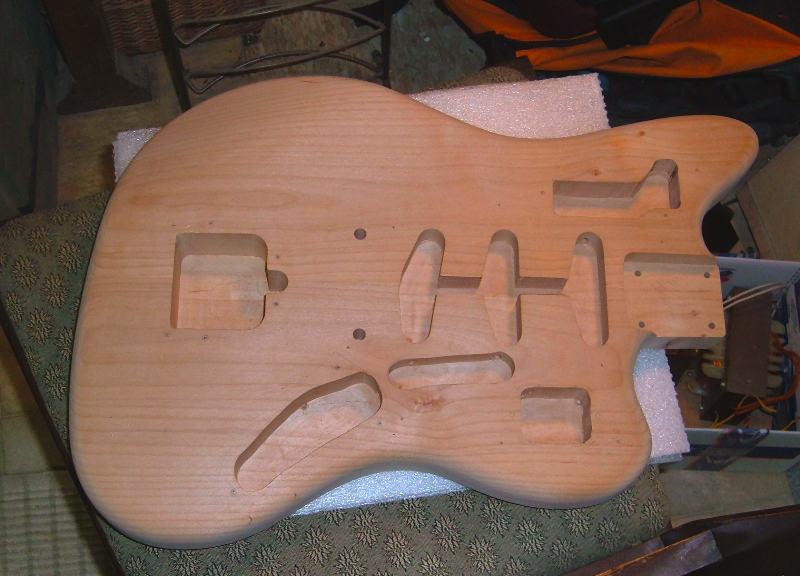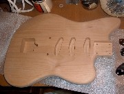 The control cavities are all routed now. The pickups will float - bolted to the pickguard, with wiring running under them. The wiring will be a stock Strat (250k pots) on the normal channel and a Jaguar circuit (1 meg pots) on the rhythm circuit, which should give a brighter surfier sound. We'll see. I'd like to make some brass sheilding for under the three control plates if I can find the right thickness brass stock. I'm also working on an aluminum shield for under the pickguard.