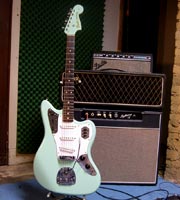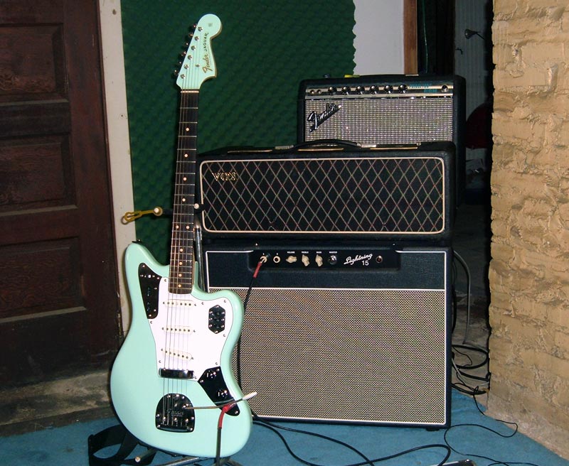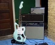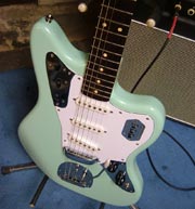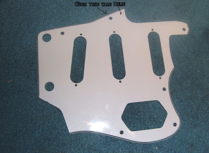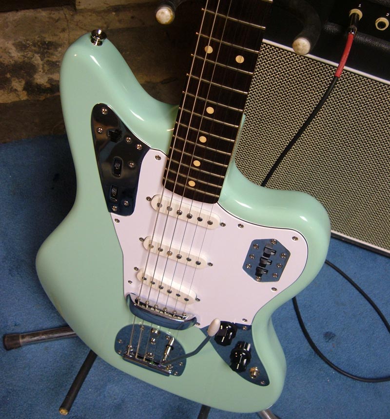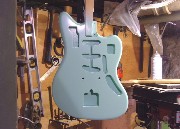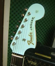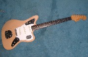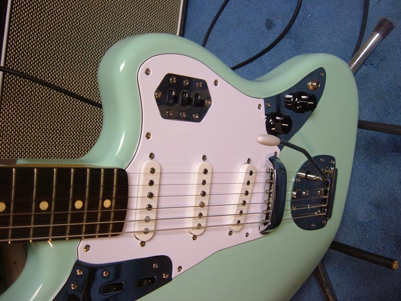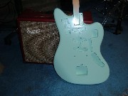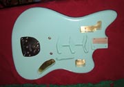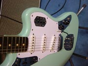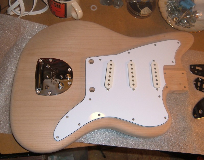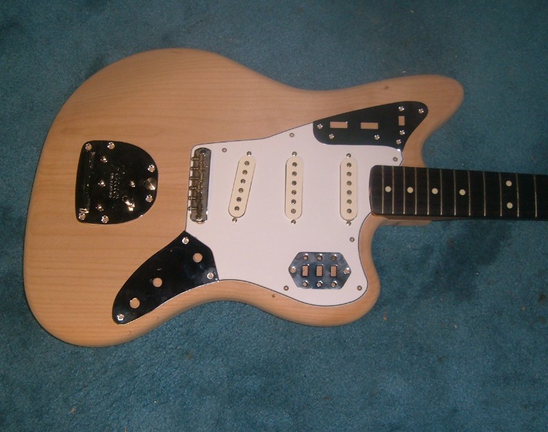 This is a full-scale (25"), three pickup Jaguar project I'd been thinking of doing for a long time. I've owned Jags over the years and loved the sound and looks, but in the end couldn't get down with the short scale. My hands are too big. I started with a USA Custom Guitars Jazzmaster body with minimal routing - just pickups, bridge and trem routs. The pickguard is also from USACG. The tremelo is a US reissue unit from Angela.com The Jaguar control plates from Guitar Parts Resource. They actually align quite well with the Jazzmaster pickguard shape.