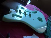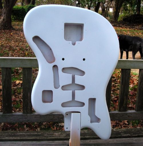 The body is now primed. I followed the Reranch 101 refinishing process. I used their grain filler, sanding sealer and white primer. No real problems. I attempted to use the 60's style fender stick method - just holding it in my left hand, shooting it with my right and moving it around a bit to prevent eny drips.