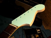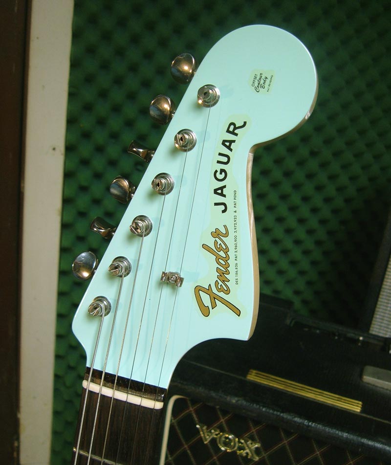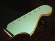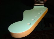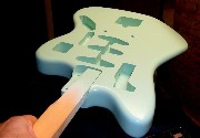 The USACG JM neck was their "US-3" CBS-ish headstock shape. I cut it down to match the classic '65 Jazzmaster headstock shape, using hand files, sandpaper and a utility knife blade. I can now give it a matching surf green headstock and a Jaguar decal. Masking the sides was pretty straightforward, though I did spray a primer coat, so I had to feather sand that, then re-mask it a hair wider to allow the color to cover the primer so I doesdnt show at the edges. A minor problem happened when I wet sanded the peghead. A little water got into the string tree hole and swelled the wood a tiny bit, cracking the paint. This may preclude clearcoating, so I may just buff out the body and call it done.