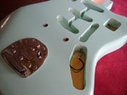 The wiring channel between pickups and the switch plate rout are now done. I'd like to get a template from a real Jag to help with the rhythm circuit routing. The rout for the trem that was done by USA CG needed to be squared off at the rear so the trem unit would clear. I used a small file for this. It just needed it at the top half inch or so.